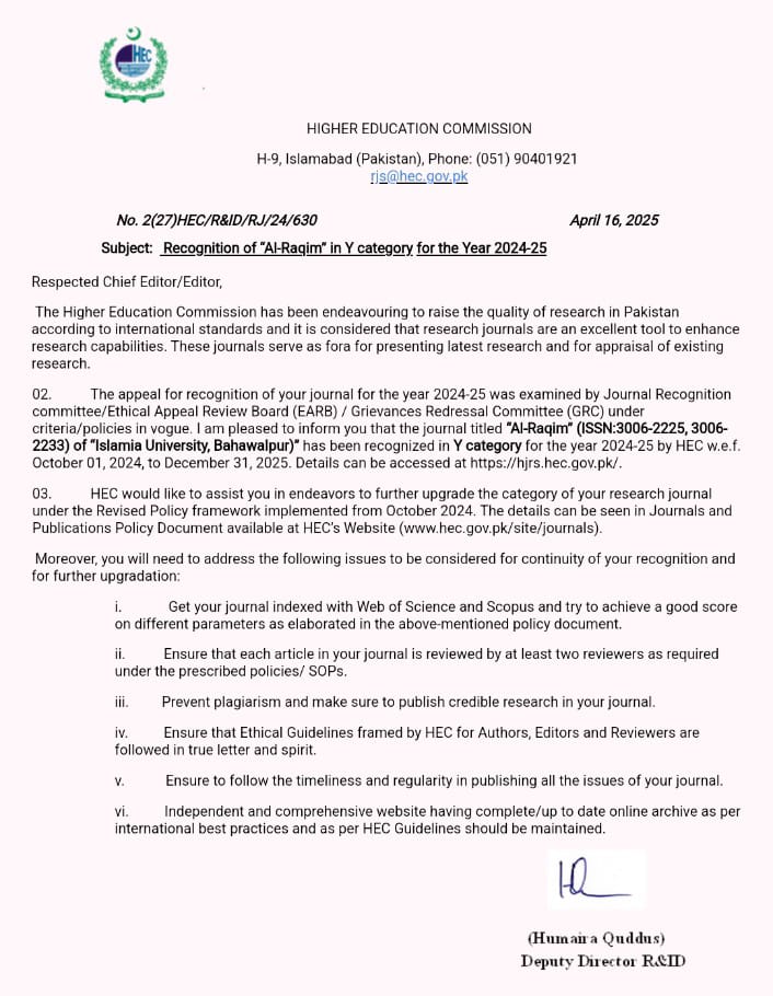 Al-Raqim is a double-blind، peer-reviewed, open-access، tri-lingual (Arabic, English, Urdu) journal published bi-annually by the department of Islamic Studies at the Rahim Yar Khan campus of The Islamia University of Bahawalpur. it was established in June 2023.Al-Raqim is a scholarly publication that serves as a platform for academics, researchers, and intellectuals to contribute their original research and critical analysis in the field of Islamic studies. With a rich tradition and a vast scope of subjects, Al-Raqim encompasses a diverse range of disciplines, including theology, philosophy, history, law, literature, arts, and social sciences. This journal aims to foster an open and rigorous intellectual discourse while promoting a deeper understanding of Islamic traditions, civilizations, and contemporary issues.