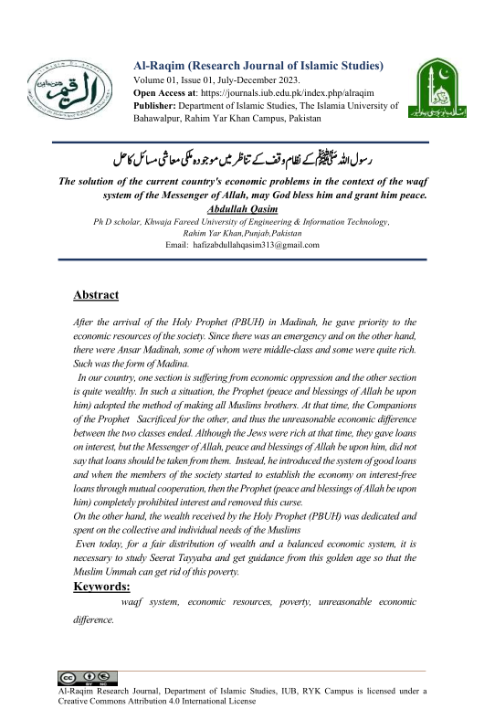 waqf system, economic resources, poverty, unreasonable economic difference رسول اللہﷺکے نظام وقف کے تناظر میں موجودہ ملکی معاشی مسائل کا حل